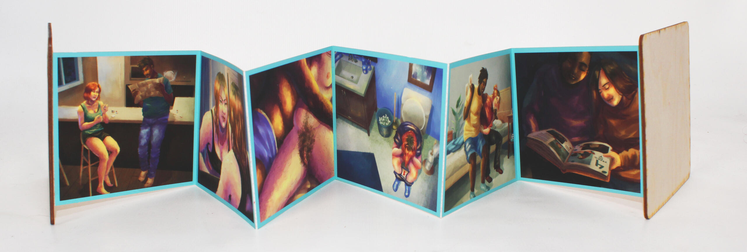 My research for Change primarily focused on transmasculine health and transition, with a touch of the history behind it. A transgender man’s transitioning experience is one that is seldom shared in mainstream media despite the importance it plays in his life. Combined with knowledge from my personal experience, my thesis research included the physical, emotional, sexual, and reproductive effects of hormone replacement therapy in trans men. I also delved briefly into gender-affirming surgical options for trans men to make their bodies more at home. Included with these medical explanations were healthcare statistics and a discussion of the negative effects of transmedicalism on the transgender community.Change serves as a digitally illustrated timeline of a trans male character’s transition. His transition story is just one way a person can experience their transition, but I hope to shed light on the process of transitioning from a trans perspective. Among the few trans narratives seen in mainstream media, several center trans pain as the central concept. While all trans stories are important to tell, this suffering-centric point of view is not the only outcome that trans people face. Instead of a story of sadness, Change is a story of hope and positivity, pervasive even through the difficult times in my character’s experience with a happy ending for both him and his partner. This illustrated timeline is printed and assembled in the form of an accordion folding book, so the viewer can unfold it and view his transition as a whole.Both my research and my personal experience informed the creation of my thesis to create an accurate and believable depiction of the transmasculine experience. Using my knowledge in both the medical and social side of hormone replacement therapy, I created an informed and personal visual display of its effects on someone’s life. With captions briefly explaining the steps in my character’s process, I show each viewer of Change what it is like to be a trans man.